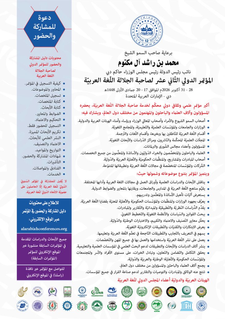 الاتحاد توثيق وتاريخ وتأثير وأثر علمي وتضامن وتكامل وانتشار عالميقناة صاحبة الجلالة اللغة العربية (اضغط هنا) للاطلاع على المحاضرات والندواتالضغط هنا للدخول على موقع المؤتمر الدولي للغة العربيةللتسجيل يرجى تعبئة المعلومات وتحميل المستندات المطلوبة بالضغط هناأعضاء مجلس الإدارةإغناطيوس بينيتاإسبانيا حكيم قاسمأستراليا رائد عبد الرحيمفلسطين سعيد أحمد الأيوبيالمغرب خالد بني دوميالأردن كاورو ياماموتواليابان وانغ يويونغالصين عواطف سليمانىالجزائر عقيلة صخريكندا أمل نصيرالأردن ماجد عطية حميدي الغزيالعراق علي يعقوبالنيجر نور الدين باشاجزر القمر وجدان الصائغالولايات المتحدة حسين حاجي ابراهيم تيكايفداغستان علاء فؤاد عبد الفتاحمصر فوزية بنت سيف بن علي الفهديةسلطنة عمان سعيدة عمر محمد ثانيالسودان شاه رستم غياث شاهأوزبكستان عبدالله بن ناصر القرنيالسعودية مواقع مؤسسات المجلس الدولي للغة العربية ومبادراتهالمؤتمر الدولي للغة العربيةقانون اللغة العربيةجمعية أقسام اللغة العربيةالمجلس الدولي للغة العربيةالاتحاد الدولي للغة العربيةصحيفة اللغة العربيةشهر اللغة العربيةالعربية العالميةالاتحاد الدولي للغات والترجمةمؤتمر السياسات اللغويةالجمعية الدولية للمجلات العلمية مواقع التواصل الاجتماعي
